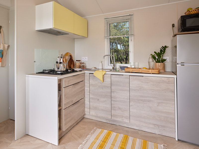 Ce mobil-home avec terrasse couverte possède 2 chambres séparées et une cuisine aménagée.