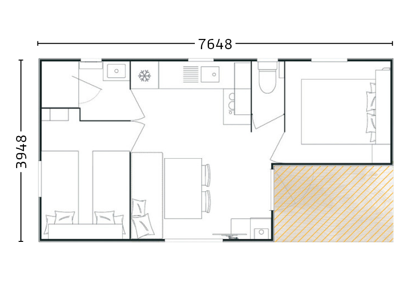 Ce charmant mobil-home avec terrasse couverte possède 3 chambres séparées et une cuisine aménagée.